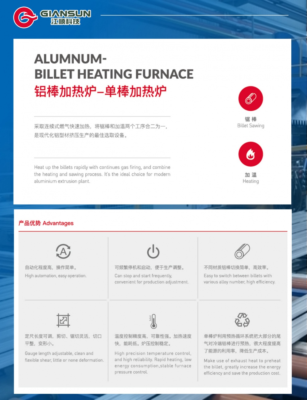 采取连续式燃气快速加热,将锯棒和加温两个工序合二为一,是现代化铝型材挤压生产的优选设备。